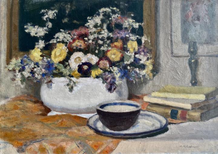 Certificato di autenticità Charles Auguste Edelmann (1879-1950) “Natura morta con fiori e libri” Olio su tela cm 54 x 73 firmato in basso a destra: Ch A. Edelmann Pittore ed illustratore francese, Charles-Auguste Edelmann, nacque a Soultz-sous-Forêts il 16 agosto 1879 e morì a Parigi il 23 novembre 1950. Originario dell'Alsazia, Ch. A. Edelmann studiò all'École des Beaux-Arts di Parigi, dove fu allievo di J.L. Gérome e Ferdinand Humbert. Espose al Salon des Artistes Français di Parigi dal 1909 al 1914, in Alsazia presso l'Union des Artistes Alsaciens, a Strasburgo e a Mulhouse. Edelmann fu membro del Salon d'Automne, dove espose nel 1919,1921,1924,1926 e 1928 ( “Fleurs et livres (natura morta)” e “Femme couchée”) Nel 1905 espose a Parigi insieme a Henry Ottmann, Albert Marquet, Suzanne Valadon e Maurice Utrillo. Alla “10° Exposition des Peintres du Paris Moderne” presso la Galerie La Boëtie di Parigi (20 gennaio al 15 febbraio 1913) espose 4 dipinti: “Marchand de journaux” “Scène de la rue” “Marchand de glaces” “Le repos” L’artista illustrò numerose opere di grandi scrittori, da Balzac a Musset, Courtine, Oscar Wilde, Eugène Montfort (Un coeur vierge). Realizzò anche numerosi pannelli decorativi. Negli anni Venti, lo Stato francese acquistò regolarmente le sue opere che andarono ad adornare sedi prestigiose come il Palazzo dell’Eliseo, la Camera dei Deputati e varie ambasciate. La critica scrisse: L’opera di Charles Auguste Edelmann è “riservata, di talento ed elegante”. Descrizione: Il dipinto qui descritto raffigurante un vaso di fiori con dei libri potrebbe corrispondere al quadro presentato al Salon d’automne del 1928 intitolato “Fleurs et livres” Opere presenti nei seguenti musei : Parigi: Centre Pompidou: “Primevères”, “Nu au miroir”;Musée National d’art moderne et contemporain: “Femme endormie” Strasburgo: Museo di Arte Moderna e Contemporanea: “Nature morte” Musée Crozatier Pays d’Art d’Histoire du Puy-en-Valay: “Un marché aux puces” Bibliografia: « Dictionnaire des peintres sculpteurs dessinateurs et graveurs » E.Benezit Vol.4 (p.107) « Dictionnaire des petits maitres de la peinture 1820-1920 » Schurr & Cabanne Les Editions de l’Amateur (pp.272-273) Stato di conservazione: