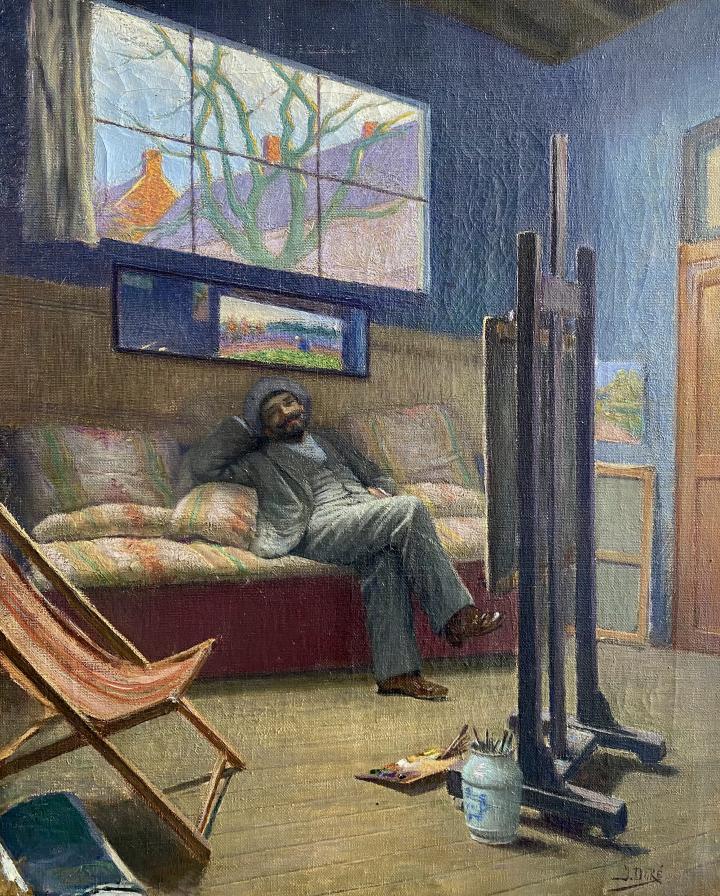 Certificato di autenticità. Jacques Doré (Anversa 1861-Halle 1929) “Le peintre dans son atelier” Olio su tela cm 46 x 56 Firmato in basso a destra : J. DORE Pittore impressionista e luminista di ritratti, interni e paesaggi; creatore di manifesti ed esploratore. Jacques Doré,figlio di Jacques Pierre Martin Hyacinthe Doré (1825-1876), musicista e tagliatore di diamanti, e di Anne Thérèse Smekens (1830-1879), nacque l'8 novembre 1861 ad Anversa. Al contrario di quanto si potrebbe pensare non ha nessun legame di parentela con l’illustratore Gustave Doré. Jacques Doré studiò disegno e pittura presso l'Accademia Reale di Belle Arti di Anversa e, a partire dal 1882, risiedette nella cittadella artistica di rue du Régent, dove si integrò nella «Bohème di Anversa». Nel 1884 Jacques Doré partecipò alla “Exposition Générale des Beaux-Arts” di Bruxelles. Negli anni 1890 e 1894 espose al circolo artistico “Arte et Labore” di Anversa. Il re Leopoldo II acquistò da lui “La Caravane près de Stanleyville”. Nel 1891, il Sindacato commerciale del Katanga reclutò una ventina di agenti europei con lo scopo di instaurare il libero commercio in varie regioni del Congo belga. Jacques Doré fece parte della missione guidata da Arthur Hodister. Colpito da epatite, egli rientrò ad Anversa il 15 settembre 1892. Per riprendersi dalla sua malattia, Jacques Doré e un suo amico, il pittore Francis Nys si recarono alle Isole Canarie durante i primi sei mesi del 1893. In seguito, ispirandosi anche agli schizzi e bozzetti riportati dall’Africa, l’artista partecipò all’ “Exposition générale des Beaux-Arts” di Bruxelles esponendo: “Soir pendant la saison des pluies sur le Loualaba (Congo)”. (1893) Al “Salon di Gand” presentando: “Derniers rayons de soleil”. (1895) Al “Salon di Anvers” nel 1901, 1904 e 1911. Jacques Doré, celibe, morì all’età di 68 anni, il 22 novembre 1929 a Halle. Descrizione: Il quadro rappresentante l’atelier dell’artista Jacques Doré ha come indiscusso protagonista il pittore stesso comodamente seduto su un divano. In primo piano possiamo osservare un cavalletto, contenente un dipinto del quale il pittore sembra particolarmente soddisfatto. Se da un primo sguardo all’opera pare che l’artista voglia gelosamente celarci il suo quadro sul cavalletto, prestando maggiore attenzione scopriamo che sopra il divano uno specchio ne rivela chiaramente il soggetto. La principale fonte di luce che illumina la stanza proviene da una grande finestra rettangolare che apre lo sfondo sull’esterno. Un abile effetto luministico evidenzia ogni elemento raffigurato mentre l’accurata e vivace scelta coloristica restituisce con grande naturalezza l’atmosfera particolarmente gioiosa dell’interno. Bibliografia : Paul Piron « PIRON : Dictionnaire des Artistes Plasticiens de Belgique des XIX et XX siècles » Ed. Art in Belgium (p.506) Andrée Dessert -Corvol « ARTO : Dictionnaire Biographique Arts Plastiques en Belgique » (pp. 441-442) Paul Piron "Deux siècles de signatures d'artistes de Belgique" Ed. Art in Belgium (p.230) Stato di conservazione : ottimo