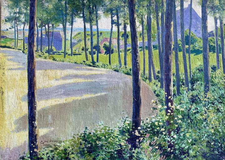 Certificato di autenticità. Firmin Baes (Saint-Josse-Ten-Noode 1874-Uccle 1943) «Viale alberato” Olio su tela incollata su cartone cm 37 x 51 cm 60 x 74 con cornice dorata XIX secolo. Firmato e datato in basso a sinistra Firmin Baes 1900 Dedicato a Jean Delescluze Firmin Baes nacque il 19 aprile 1874, morì il 4 dicembre 1943. Pittore, pastellista , disegnatore e incisore. Particolarmente abile nell’uso del pastello, dipinse nature morte, scene di genere, ritratti, nudi, paesaggi e interni. Figlio di Héloïse Boly e di Henri Baes pittore, architetto, direttore de “L’Ecole des Arts Décoratifs” di Bruxelles e membro della “Commission des Monuments historiques”. Cresciuto in una famiglia di artisti, anche lo zio Jean-Baptiste Baes era architetto, Baes inizio il suo percorso artistico lavorando con il padre come decoratore. In seguito, egli si formò presso “l’Académie Royale des Beaux-Arts” di Bruxelles sotto la direzione di Léon Frédéric (1888-1894). Dal 1894 al 1900 perfezionò il suo stile presso “l’Académie de la Patte de Dindon” . Si trattava di un’accademia libera dove si tenevano lezioni d’arte, chiamata così in onore di un caffè omonimo situato nella Grand-Place di Bruxelles. Con i collaboratori del padre, Firmin Baes sviluppò una tecnica del pastello su tela descritta nella monografia a lui dedicata curata dalla nipote Georgette Naegels-Delfosse. Tale tecnica permetteva l’applicazione della polvere con la punta del pollice o del mignolo, creando toni discreti o vigorosi e una delicatezza vellutata nelle composizioni. La morbidezza dei suoi pastelli e la sua capacità introspettiva nella resa delle figure gli valsero a partire dal 1915 la commissione di numerosi ritratti della “société” belga. Baes fu Segretario del circolo “Pour l’Art” (Bruxelles 1892-1934) per le esposizioni del quale egli realizzò diversi manifesti . (in allegato la locandina del XXI° Salon ) Questa associazione fu fondata da un gruppo di artisti nell’intento di organizzare mostre con una particolare apertura nei confronti dei pittori stranieri. Nel 1902 Baes sposò Marie Nélis, amica delle sue sorelle Irma e Alice. Ebbero tre figlie. La sua carriera artistica decollò, ottenendo numerosi riconoscimenti sia in patria che all’estero. L’artista partecipò ai “Salons Triennaux” di Bruxelles e di Gand considerati una vetrina molto importante per gli artisti che cercavano di farsi notare per poter vendere le loro opere. Queste rassegne di arte contemporanea erano oggetto di forte interesse da parte del pubblico e spesso teatro di accese discussioni estetiche. Baes partecipò regolarmente alla « Exposition Générale des Beaux-Arts » di Bruxelles esponendo nel 1897 : « Le retour de l’enfant prodigue» ; nel 1900 : « Les porteuses de trèfle », “Portrait de Mme V.R.” ; nel 1903 : « Le défi » ; nel 1907 : « Les foins », « La Bénédicité »; nel 1914: “L’enfant”; Al “Salon de Gand” espose: nel 1913 : “La femme au chou” All’Esposizione Universale di Parigi del 1900 espose : “Le Tir à l’Arc” (Medaglia di bronzo) Inoltre partecipò alla Esposizione Universale di Bruxelles del 1910 e a numerose altre importanti manifestazioni. (cfr.Scheda in allegato) Espose frequentemente a Bruxelles presso la “Petite Galerie” e la “Galerie du Studio” e a Charleroi presso le “Nouvelles Galeries”. Nel 1919, Baes divenne membro della “Société Royale des Beaux-Arts” Nel 1923 fu nominato **Ufficiale dell’Ordine della Corona**. Scrittore nel tempo libero, pubblicò un opuscolo illustrato intitolato “Histoires de peintres racontées et illustrées par Firmin Baes” (Storie di pittori raccontate e illustrate da Firmin Baes), contenente aneddoti relativi a pittori e alle loro opere (pubblicato a Bruxelles nel 1941, Librairie Générale-Cooreman). Descrizione: Il dipinto qui descritto rappresenta un viale alberato dove il susseguirsi dei tronchi conduce abilmente l’osservatore all’interno del paesaggio. Attraverso il suggestivo effetto di luce che penetra attraverso gli alberi per illuminare il sentiero e i fiori in primo piano , Baes mette in mostra la sua nota capacità nel trattare gli effetti luministici. Il quadro risale al 1900, anno in cui l’artista vinse la medaglia di bronzo alla Esposizione Universale di Parigi ed è dedicato a Jean Delescluze, un pittore decoratore che probabilmente Baes conobbe durante la sua prima formazione artistica. A dimostrazione del particolare interesse del pittore nei confronti del paesaggio alberato allego una parte dei numerosi quadri ,raffiguranti lo stesso soggetto, presenti nella collezione del Museo Reale delle Belle Arti di Bruxelles. Opere nei seguenti musei: Bruxelles : Musées Royaux des Beaux Arts de Belgique ; Ixelles : Museo delle Belle Arti ; Anversa, Charleroi, Ostende, Ypres, Parigi: “Musée d’Orsay” E.Bénézit « Dictionnaire des peintres,sculpteurs, dessinateurs et graveurs » Ed.Grund vol.1( p.372 ) Paul Piron « PIRON : Dictionnaire des Artistes Plasticiens de Belgique des XIX et XX siècles » Ed. Art in Belgium (p.48) Andrée Dessert -Corvol « ARTO : Dictionnaire Biographique Arts Plastiques en Belgique » (pp. 32,34) Paul Piron "Deux siècles de signatures d'artistes de Belgique" Ed. Art in Belgium (p.22) « Dictionnaire des petits maitres de la peinture 1820-1920 » Schurr & Cabanne Les Editions de l’Amateur (p.48) Stato di conservazione : ottimo